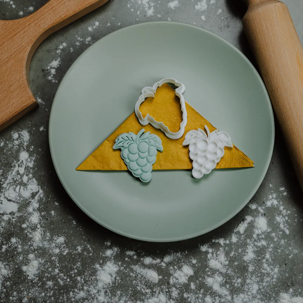 Modla grozda sa litovima za ukrase za slavski kolač. Set sadrži sekač za sečenje i oblikovanje testa i utiskivač koji pravi šaru grozda. Utiskuju se tačno jedan u drugi za što precizniju šaru. Ivice su optimalno tanke za lakše i precizno sečenje. Dubina modle je 13mm. Utiskivač ima dršku za jednostavnije vađenje iz testa.